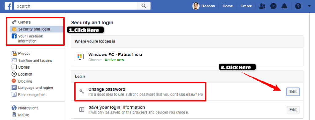 Step 2 . अब दूसरे स्टेप में Security and Login पर क्लिक करने के बाद आप नीचे बताये गए इमेज के अनुसार लॉगिन के नीचे दिए गए चेंज पासवर्ड (Change Password) पर क्लिक कीजिये।
