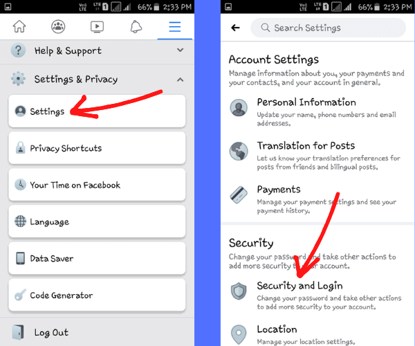 अब नीचे थोड़ा स्क्रोल डाउन करके सेटिंग्स (Settings) पर क्लिक कीजिए। अब उसके बाद सेटिंग्स पर क्लिक करने के बाद अपने फेसबुक अकाउंट के सेटिंग पेज में Security and Login पर क्लिक कीजिये। जो की आप नीचे इमेज में भी देख सकते हैं।