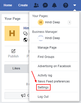 Step 1 . सबसे पहले अपने फेसबुक अकाउंट में लॉगिन कजिये उसके पस्चात दाये तरफ में नीचे दिए गए इमेज के अनुसार सेटिंग पर क्लिक करे।