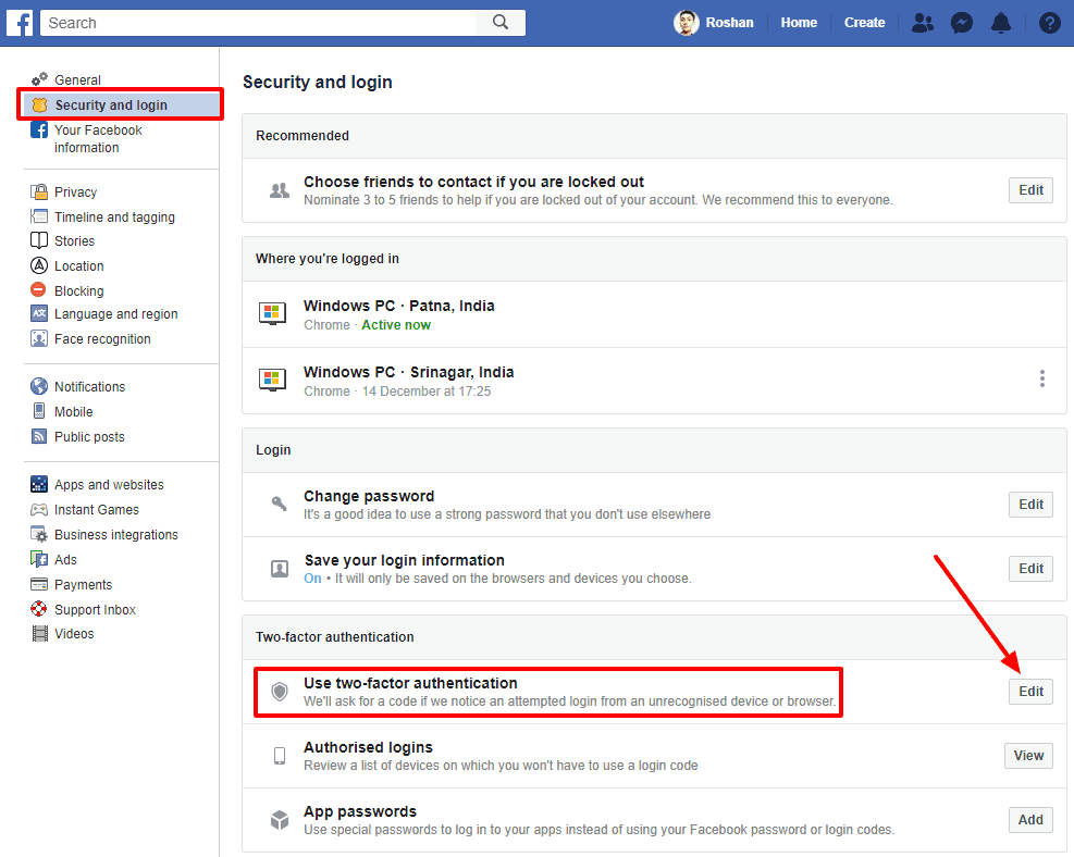 Step 2 . अब Security and Login पर क्लिक करने के बाद पेज को थोड़ा स्क्रॉल डाउन करने पर इमेज के अनुसार Use Two Factor Authentication के सामने दिए गए एडिट (Edit) बटन पर क्लिक करे।