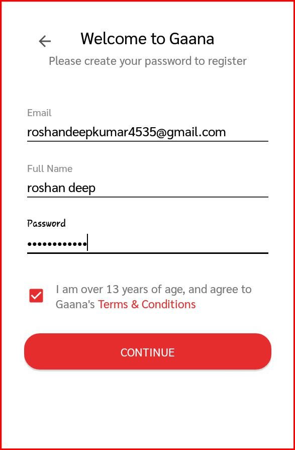 STEP 3 . अब आप अपना Full Name और Password फिल करके नीचे Agree to Gaana’s Terms and Conditions पर क्लिक करके Continue पर क्लिक कर दें।